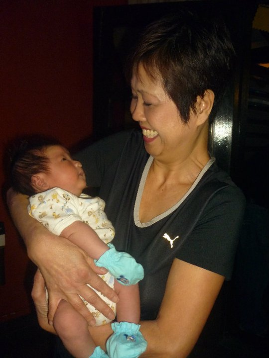 My great-grandma couldn't make it to my one-month birthday party because of a fall and leg injury, so we visited her instead.